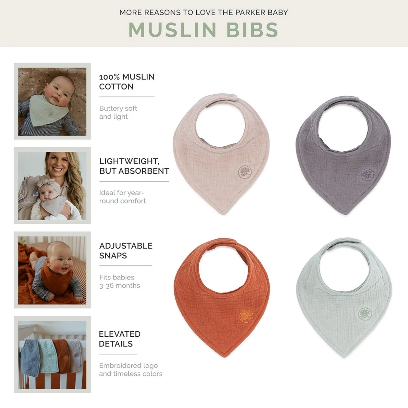 Meet the Pebble Muslin Bibs: the perfect premium bibs to catch all that spit up, food mess, and drool so your baby stays dry and comfortable. Our Muslin Bibs are crafted with elevated details and buttery soft, absorbent muslin cotton so your baby's outfits stay dry! Easy to snap on and swap throughout the day, they're a baby essential you definitely don't want to miss out on. Our Pebble Set features: